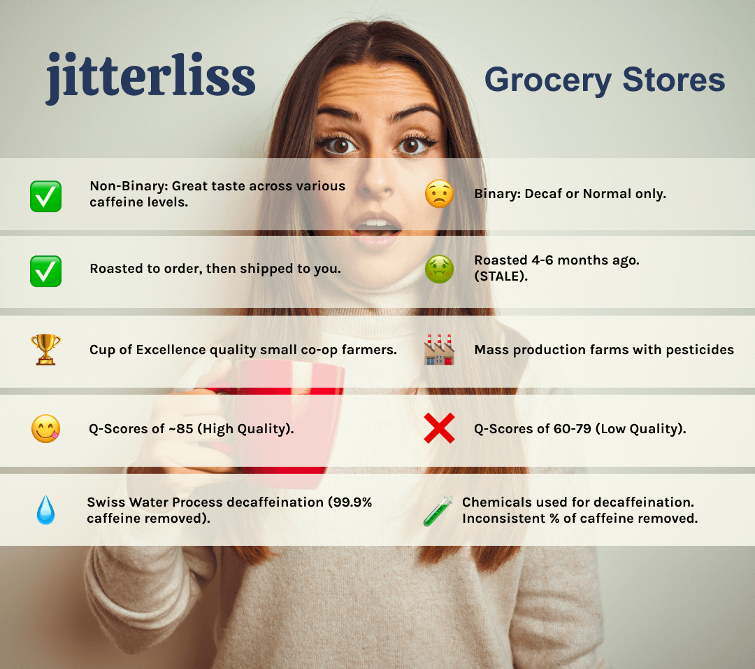We only buy specialty grade coffee and we do not sell regular coffee. We focus all our taste testing decaf roasts. Our beans always have ~85 Q-Score because of our Cup of Excellence quality farmers. Our beans go through a chemical free decafination have a 99.9% caffeine removed guarantee.