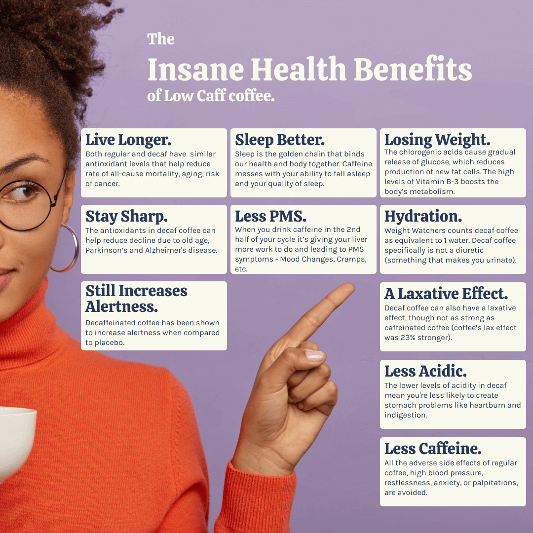 Decaf has gotten a bad rap over years. But times are changing. When you put this much love and attention into decaf, even the most avid coffee drinkers ask for refills. And it allows for the creation of delicious low caff coffee!