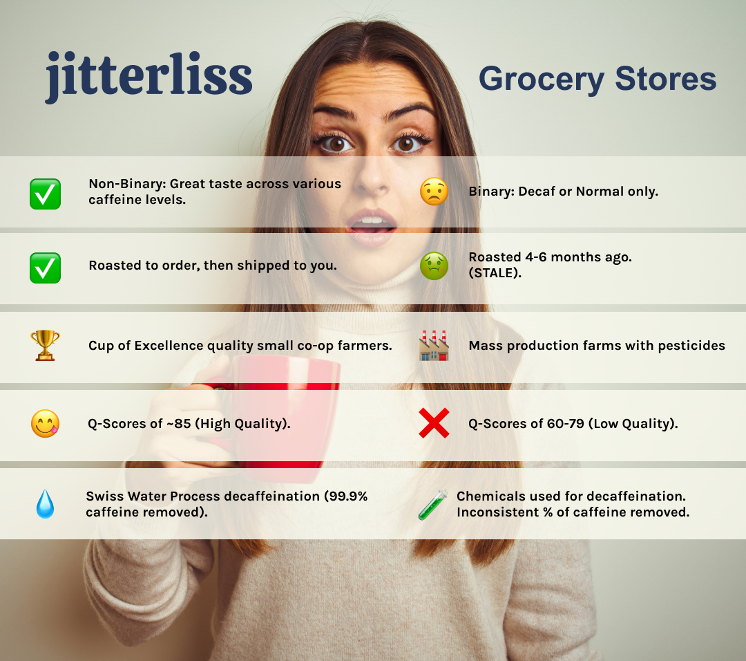 We only buy specialty grade coffee and we do not sell regular coffee. We focus all our taste testing on decaf roasts. Our beans always have ~85 Q-Score because of our Cup of Excellence quality farmers. Our beans go through a chemical-free decaffeination and have a "99.9% caffeine removed" guarantee.